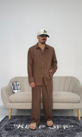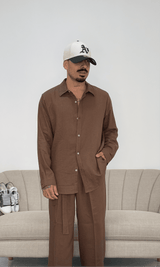 Camicia in lino con collo francese, nella colorazione tabacco.