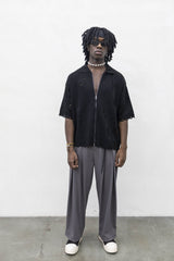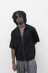 Cardigan mezze maniche in lanetta con chiusura a zip e rotture, nella colorazione nera.