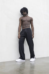 Pantaloni fondo largo chiusura un bottone elastico sul retro, e spacchetto laterale sul fondo, nella colorazione nera.