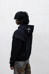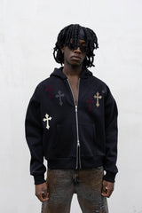 Felpa con cappuccio,zip e croci sul fronte e cappuccio nella colorazione nera by Re born, nuovo brand in casa hall of fame.