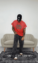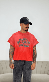 Felpa garzata smanicata con lesioni e ricamo sul petto nella colorazione rossa.
