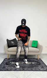 T-shirt mezza manica con tagli sulle spalle e stampa sul fronte, nella colorazione nera.
